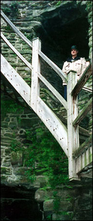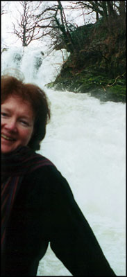 Snowdonia is all about stunning, make-you-gasp views, lovely people, quaint towns and waterfalls (see picture of Becky below at the Swallow Falls). Unfortunately most off-road site seeing was out of the question because of the epidemic but we could see enough from the road to understand the area's attraction. We visited the town of Beddgelert where we picked up a nifty, brass fox door knocker similar to several we'd seen around Conwy. We also stopped at the Trefiew Woolen Mills where we bought some wool place mats woven at the site on ancient looms.